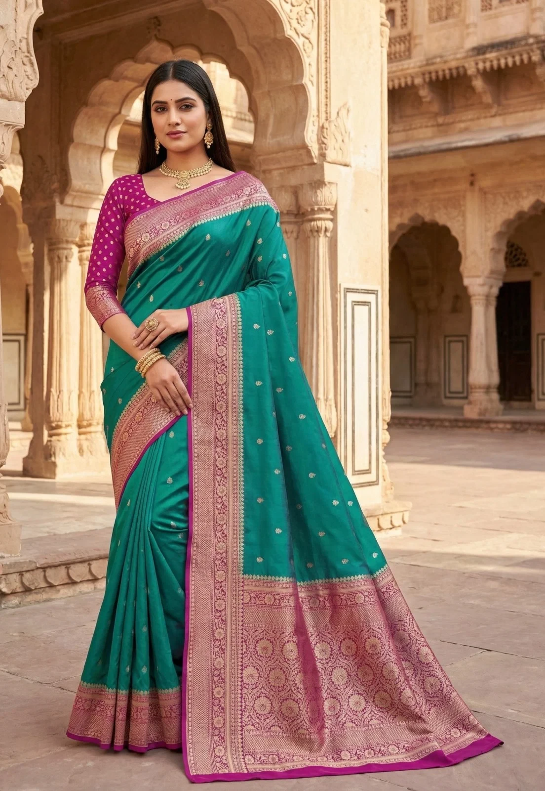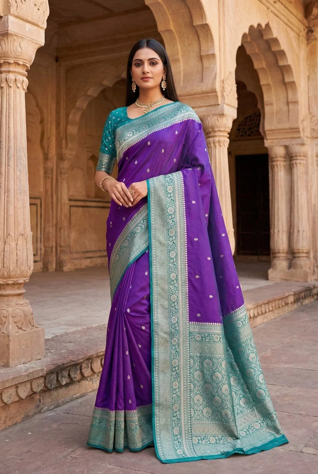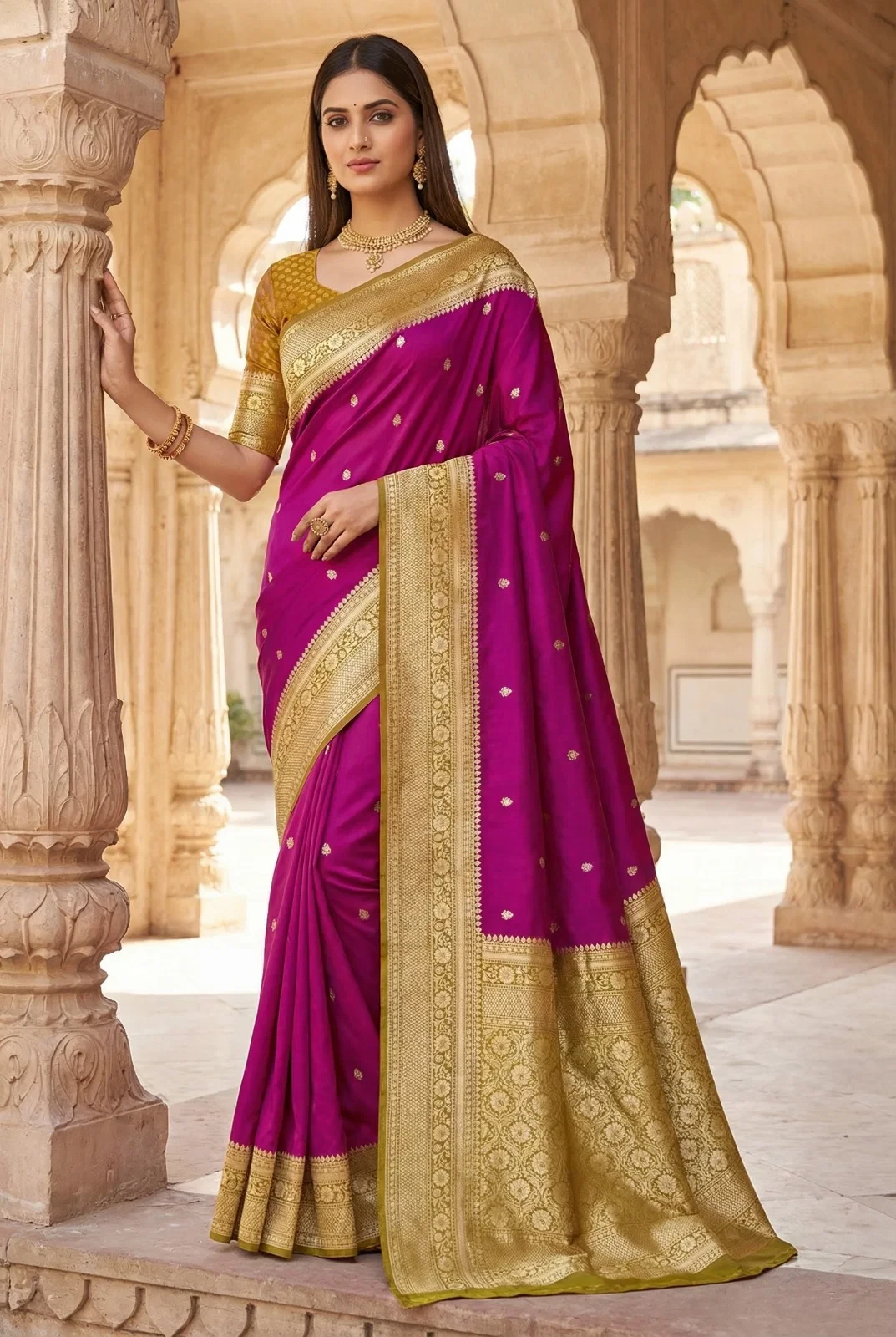 | Saree | Premium Soft Banarasi Silk with Zari Weaving All Over and Contrast Banarasi Border Woven with Traditional Paisley Motifs and Meenakari Woven Pallu |