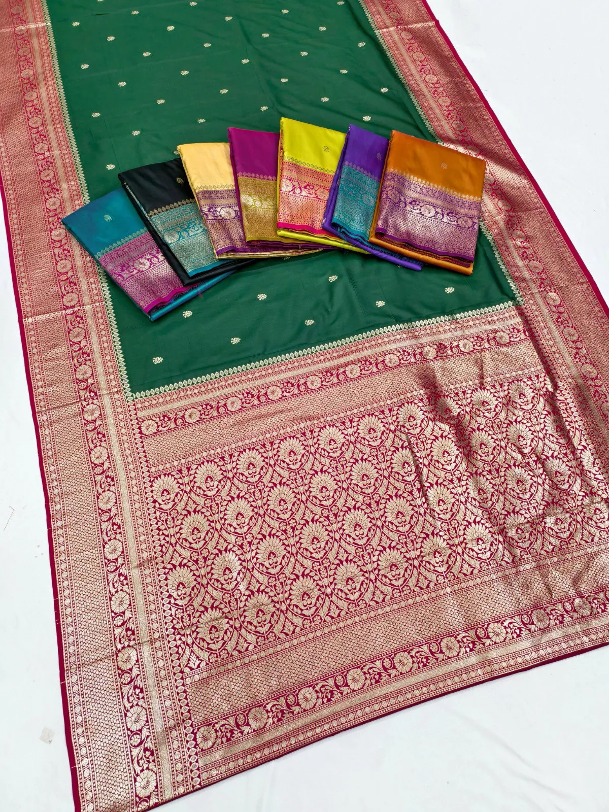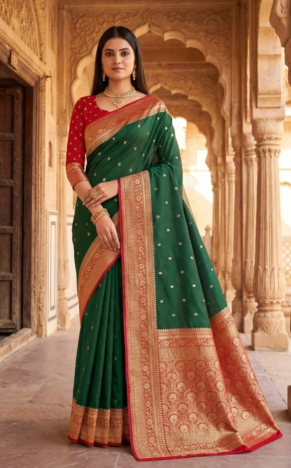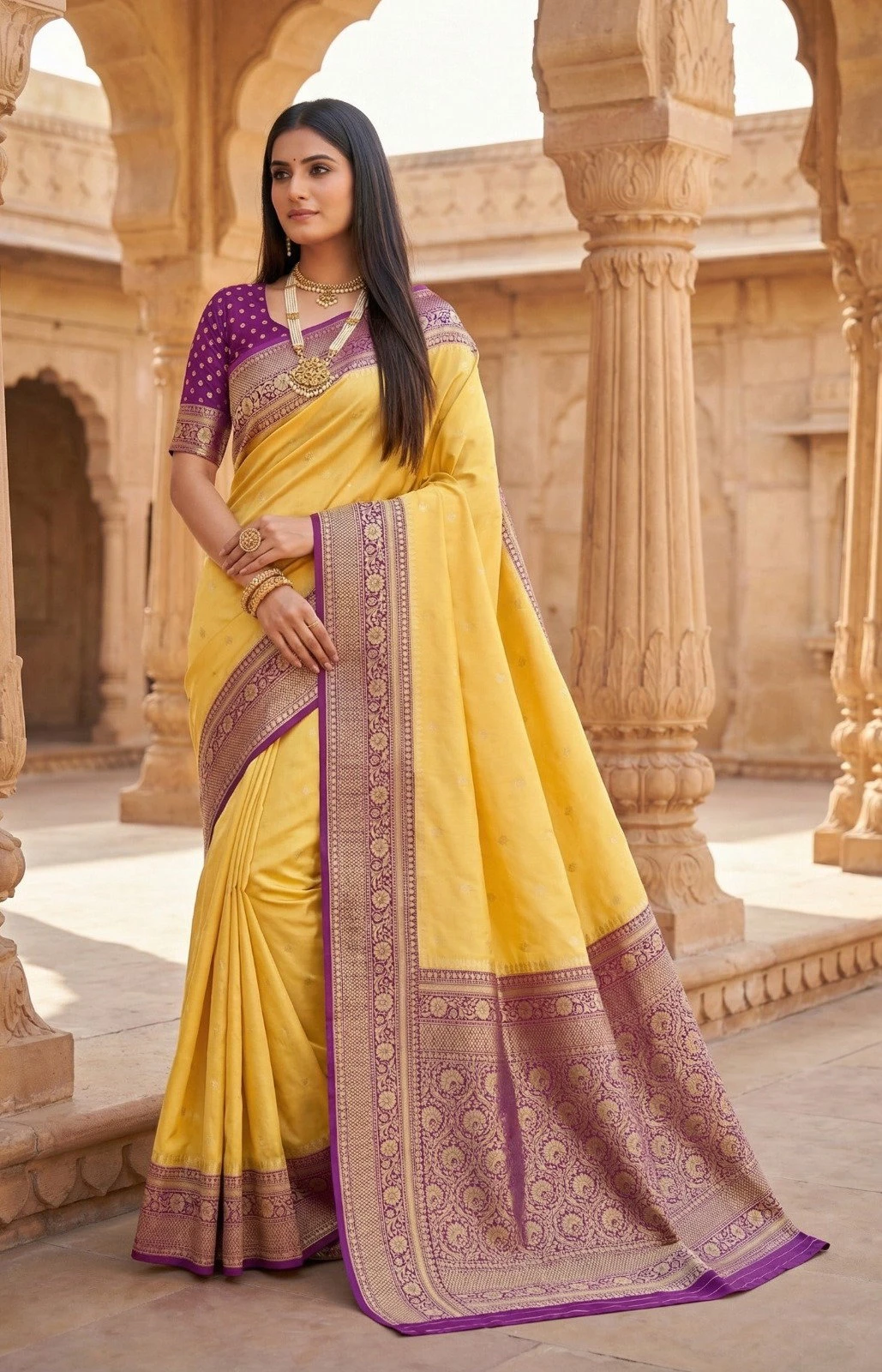 | Saree | Premium Soft Banarasi Silk with Zari Weaving All Over and Contrast Banarasi Border Woven with Traditional Paisley Motifs and Meenakari Woven Pallu |