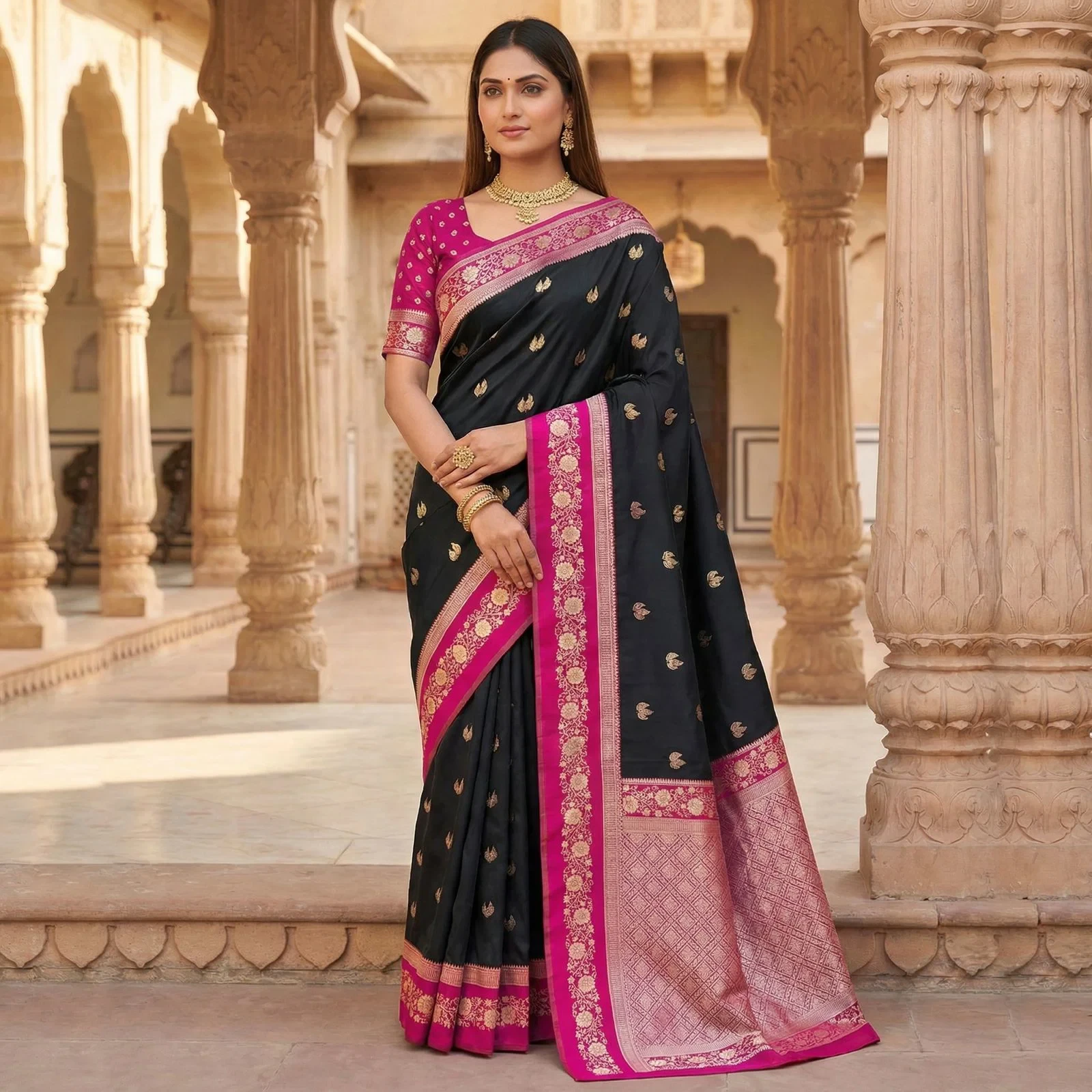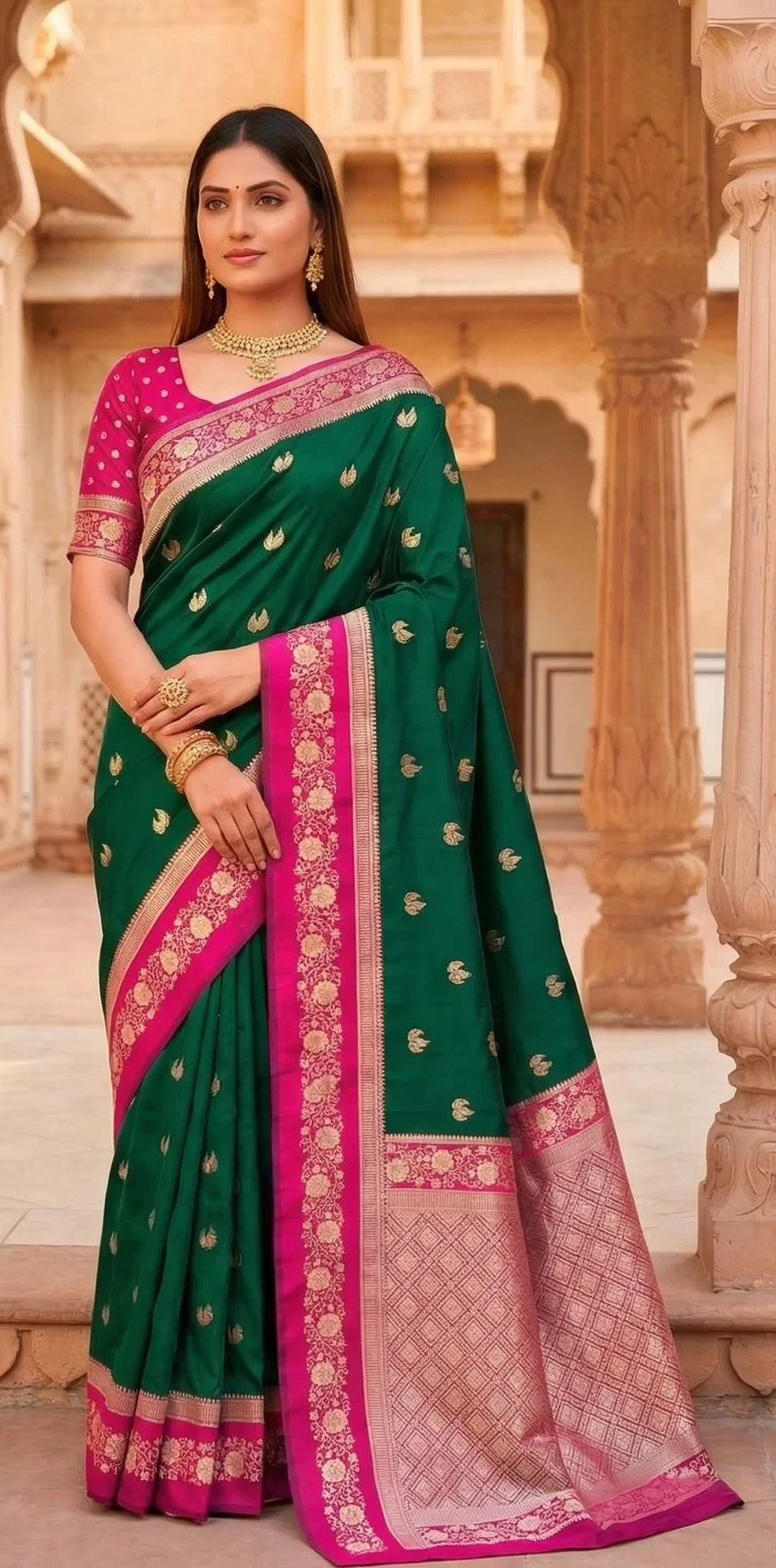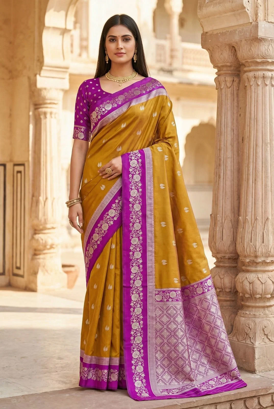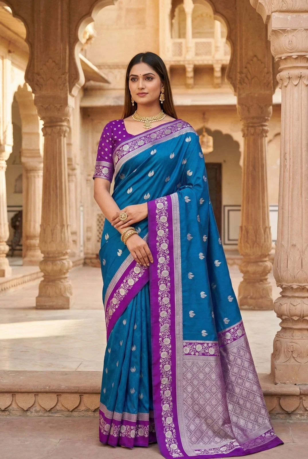 | Saree | Premium Soft Banarasi Silk with Zari Weaving All Over and Meenakari Woven Pallu |
