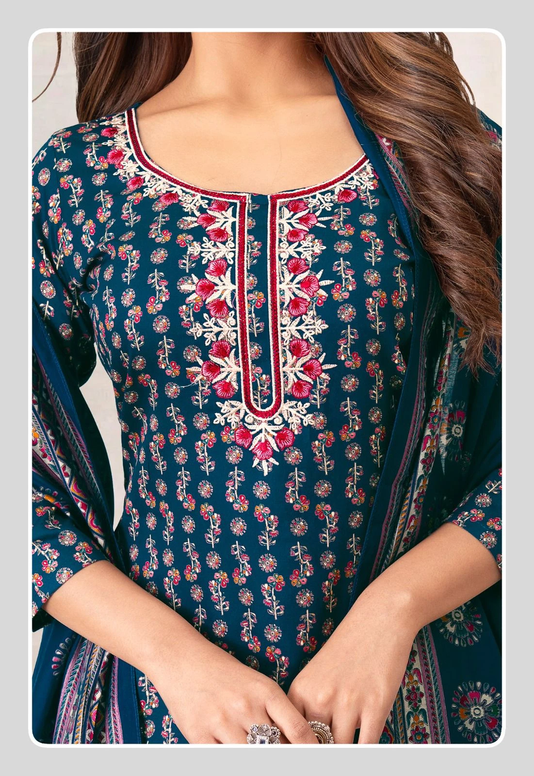 | Top | Heavy Jam Satin With Discharge Print, Foil And Neck Embroidery |