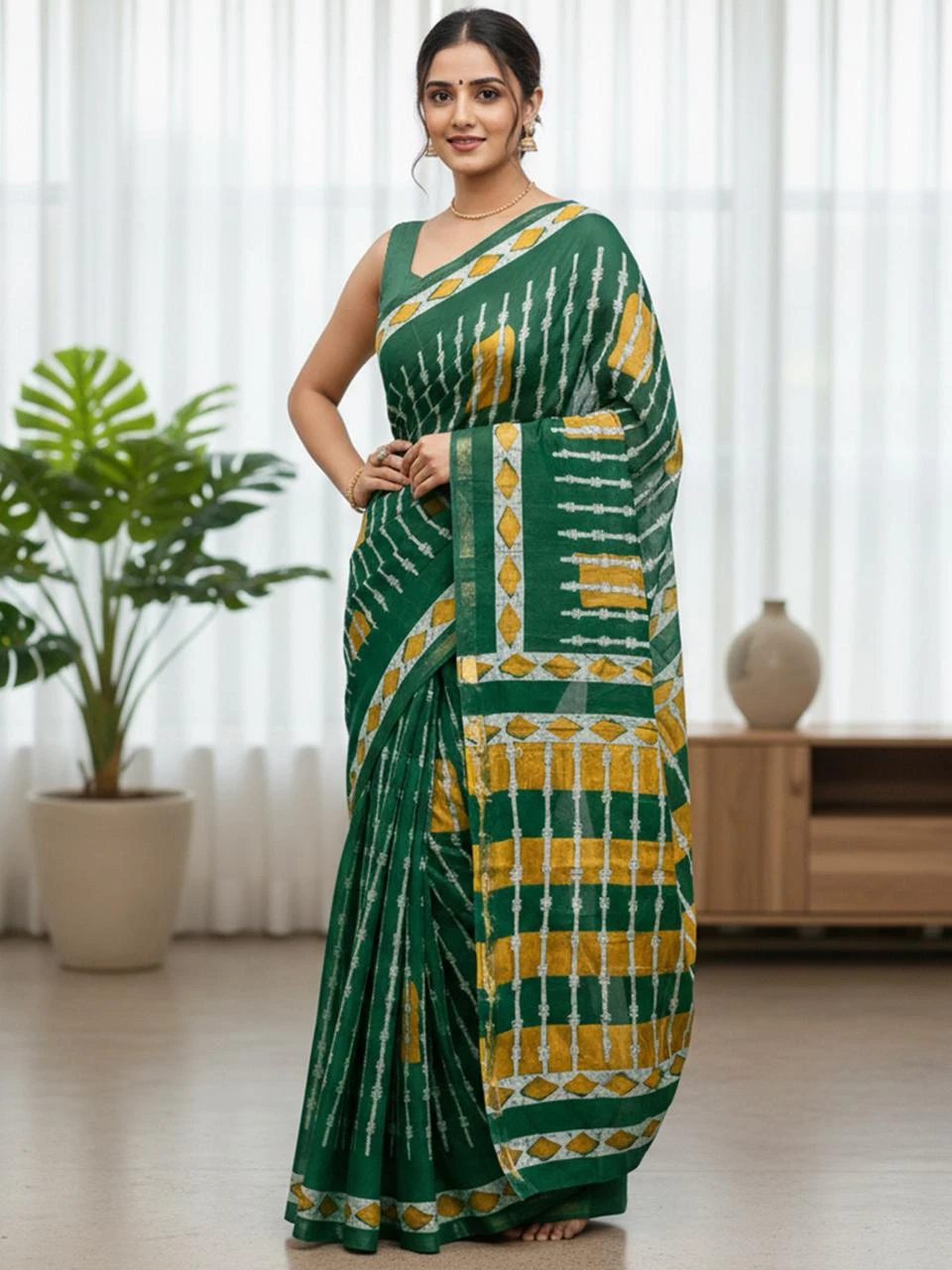 Fabric Modal Cotton Saree Crafted with Natural Colored Bagru Block Prints Woven Zari Border