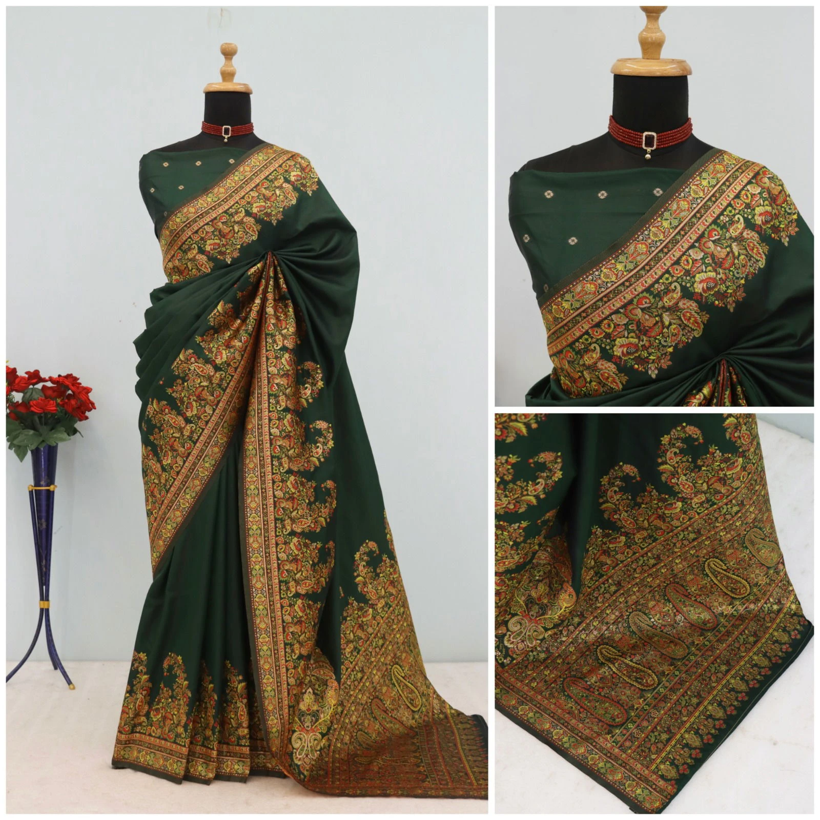 | Saree | Pashmina Silk with Multi Color Paisley Border and Contrasting Pallu with Woven Motifs |