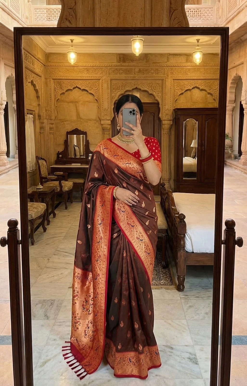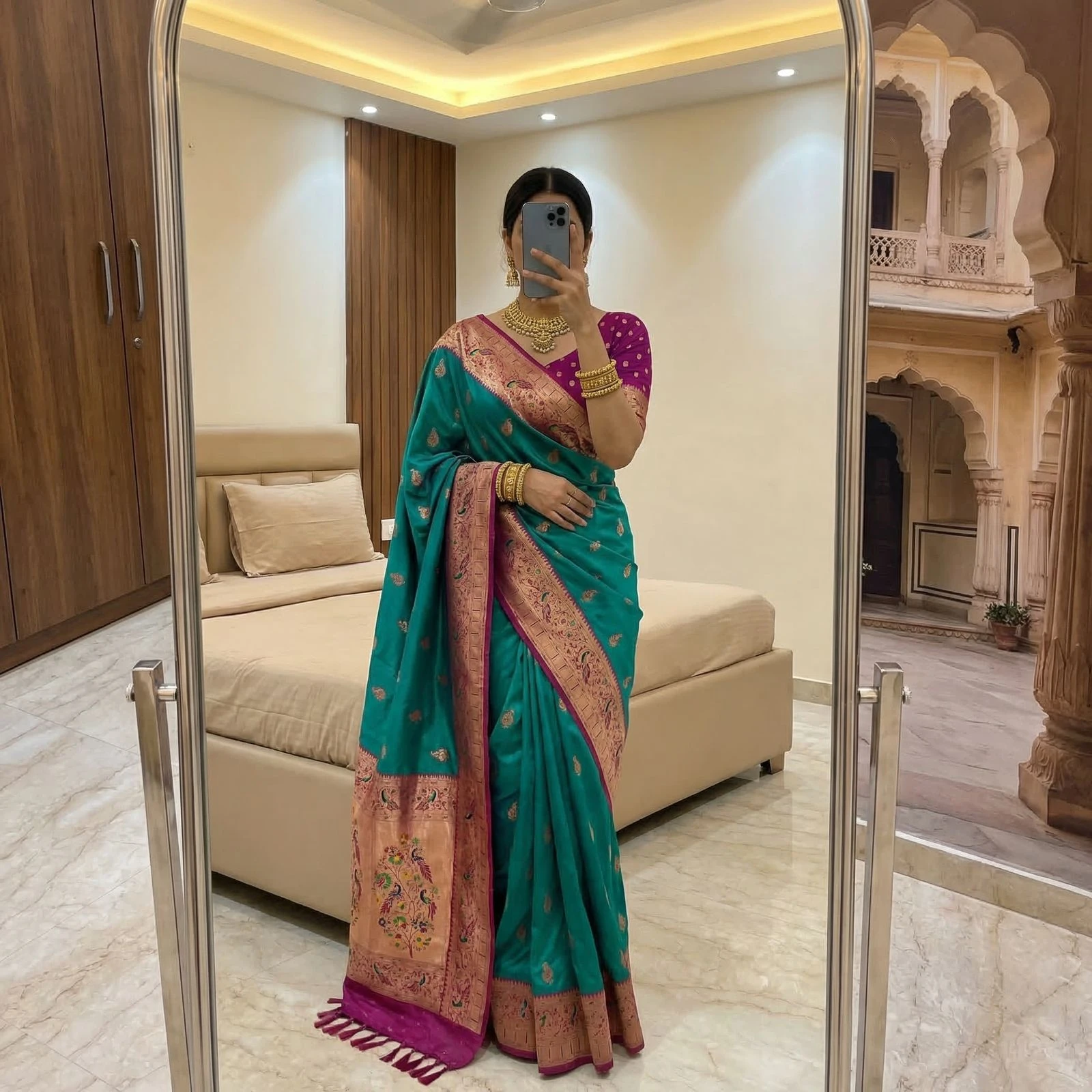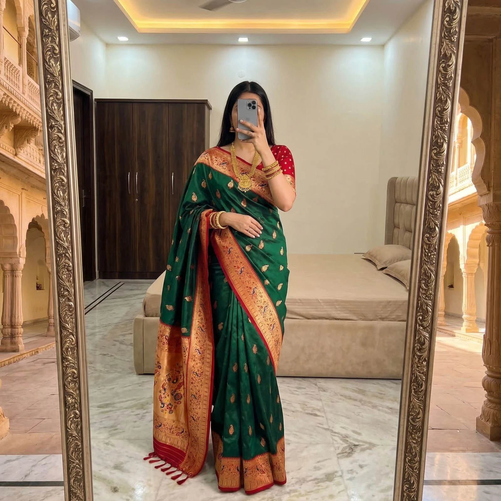 | Saree | Soft Paithani Silk with Banarasi Paithani Style with Rich Zari Weaving Work |