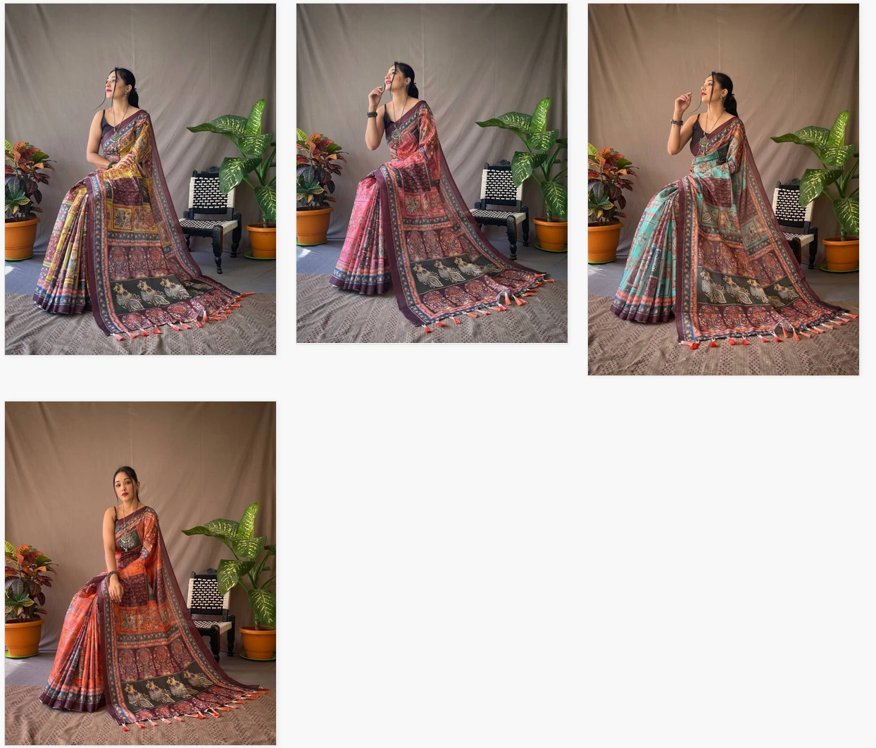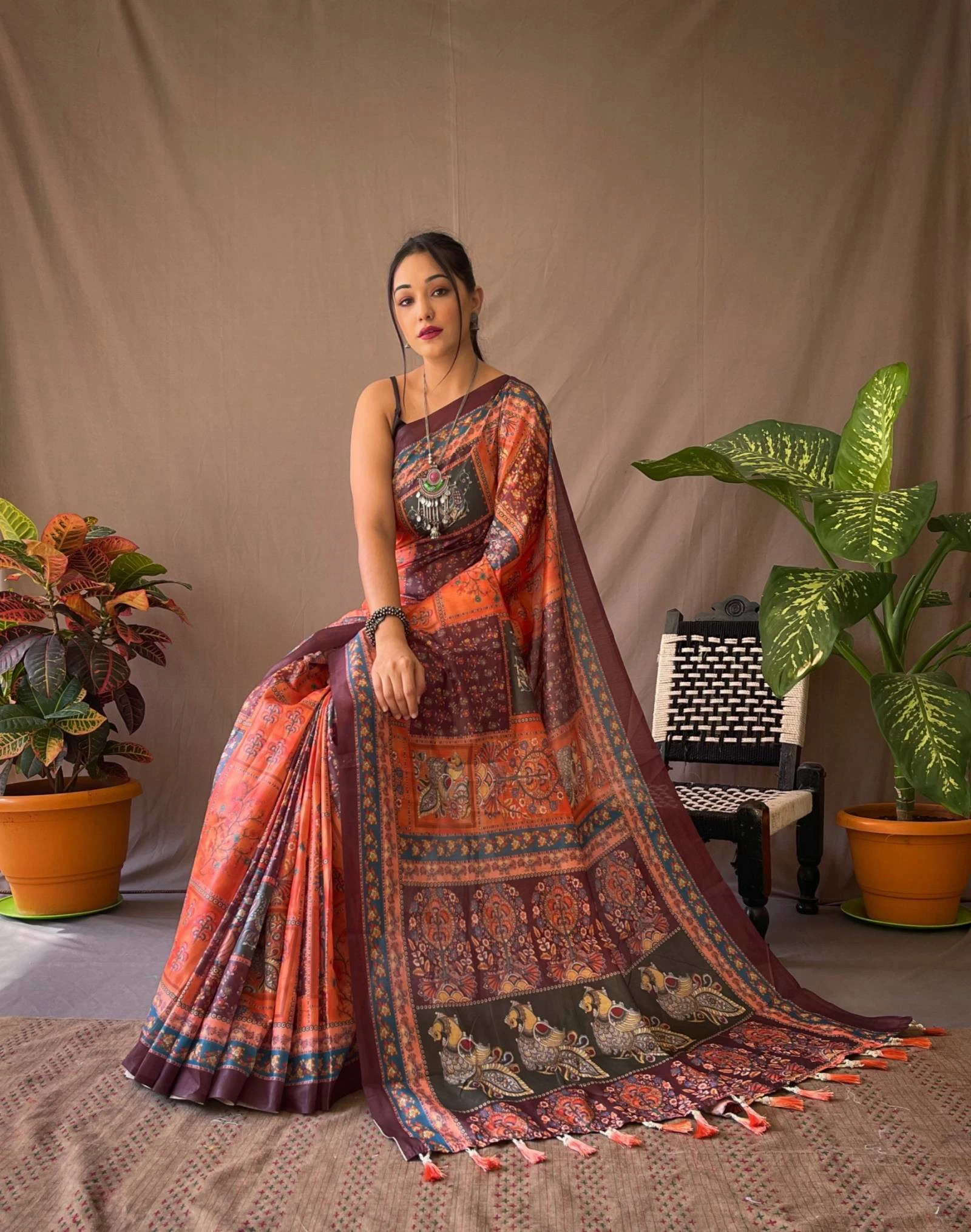 Fabric Cotton Saree Crafted with Kalamkari Digital Print with Contrast Border & Conceptual Pallu with Tassels
