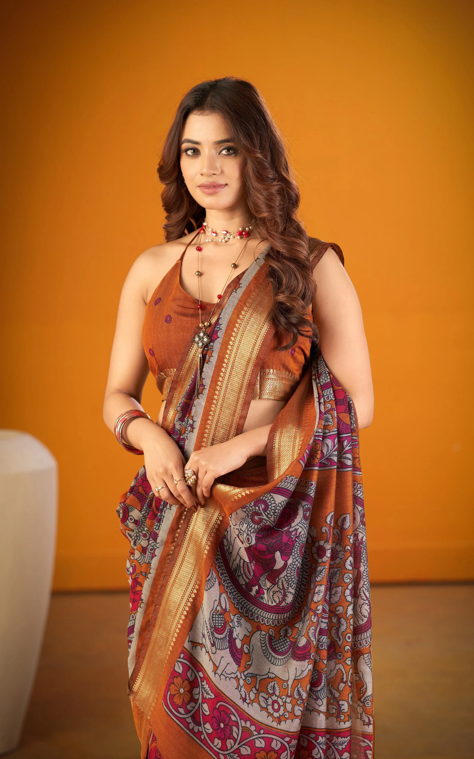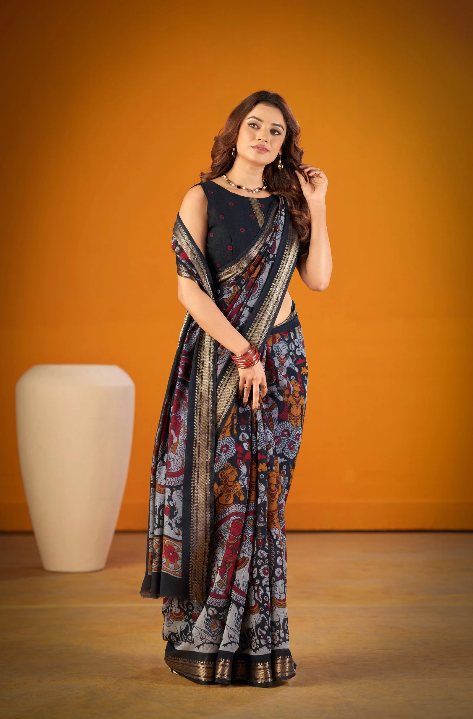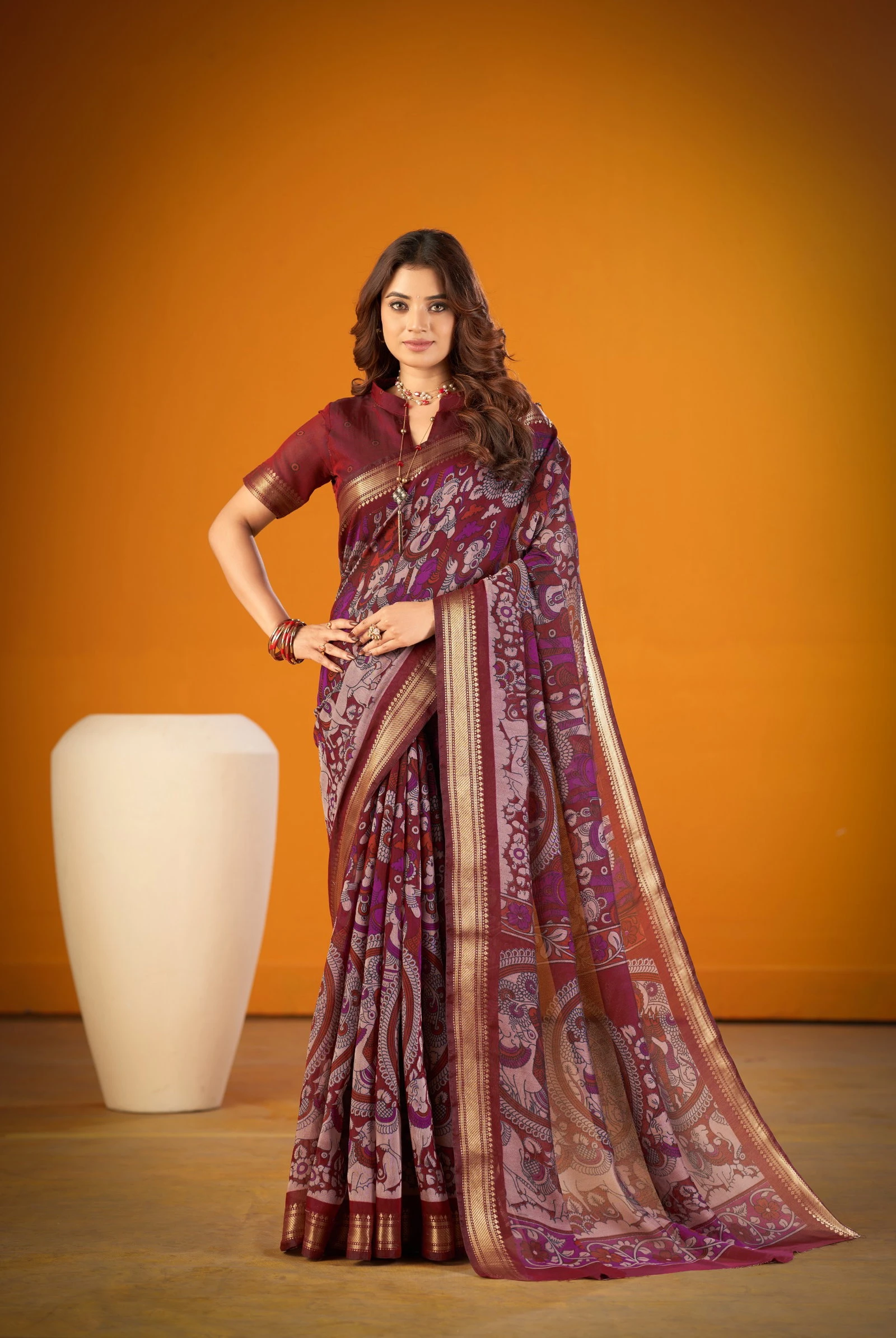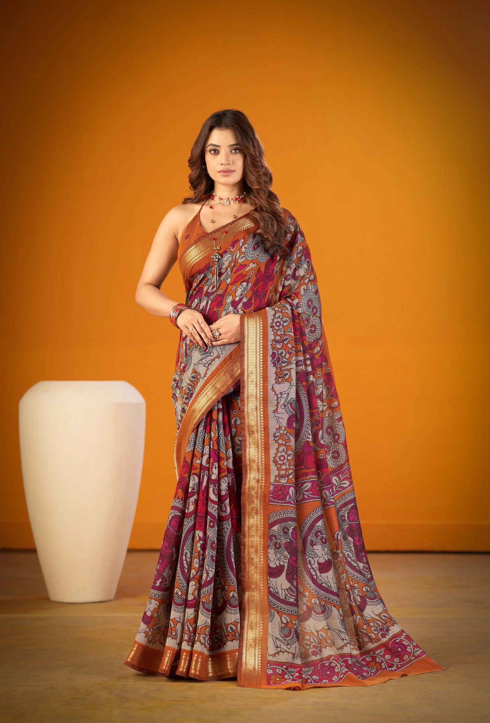 | Saree/blouse | Polyester Viscose Chanderi with Kalamkari Print with Zari Weaving Work |